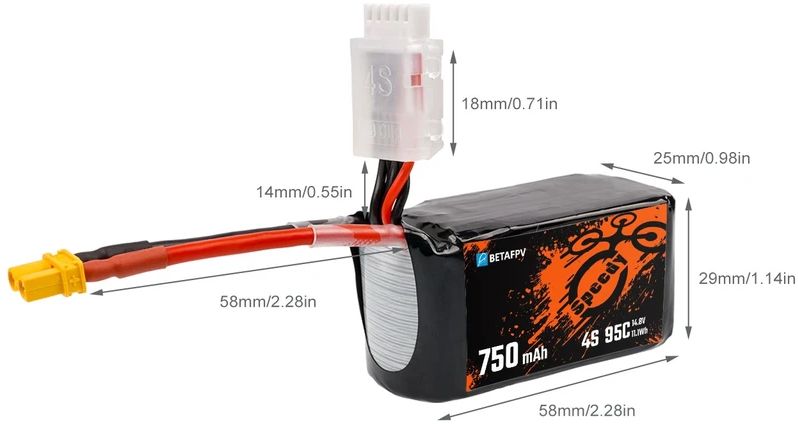 - This battery has a 4S(14.8V) high voltage and 95C high discharge rate, combined with a 750mAh large battery capacity, which will greatly extend the flight time. (6.30mins for Beta95X V3 Digital VTX, 7mins for Beta95X V3.)