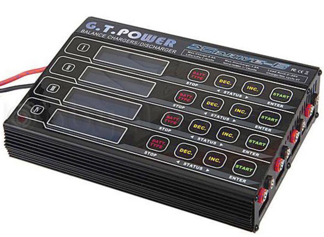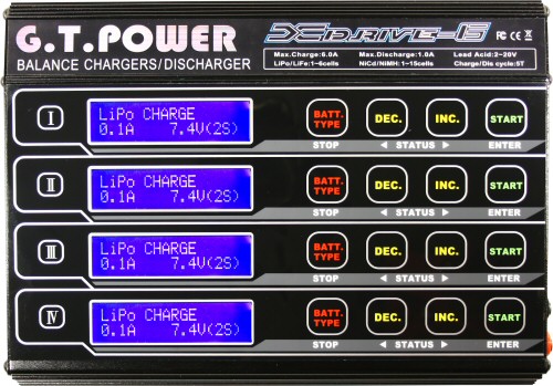 The X-Drive 6 can charge or discharge up to 4 x 15 cells of NiCd/NiMH or 4 x 6S Lithium batteries. Each output can charge up to 6A (depending upon cells/watts).