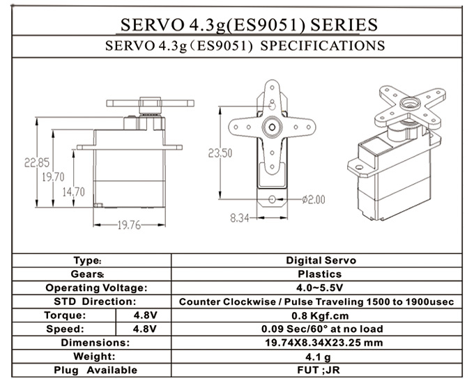 - Operating Speed: 4.8V 0.09 Sec/60° at no load