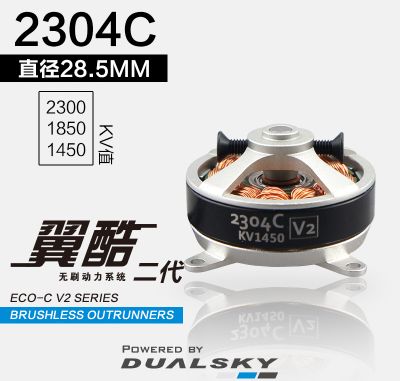 DualSky:n uusi ECO V2 moottorisarja. Moottorit ovat poikkeuksellisen kevyitä tarkan työstönsä takia. Moottoreissa japanilaiset laakerit ja valmistuksessa on käytetty parhaita materiaaleja. Tämä moottori on sopiva sisälennokeille kaksi kennoisella akulla (50 W, 92W 15 s), moottorissa kevyempi ontto akseli. Sopiva alle 400 g lennokeille tai 200g 3D lennokit. Integroitu potkurinsäästäjä ja kiinnityskorvakkeet.