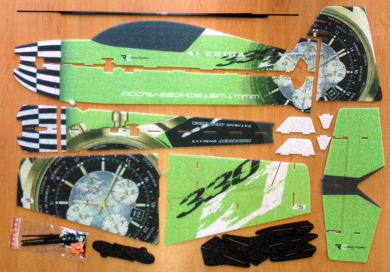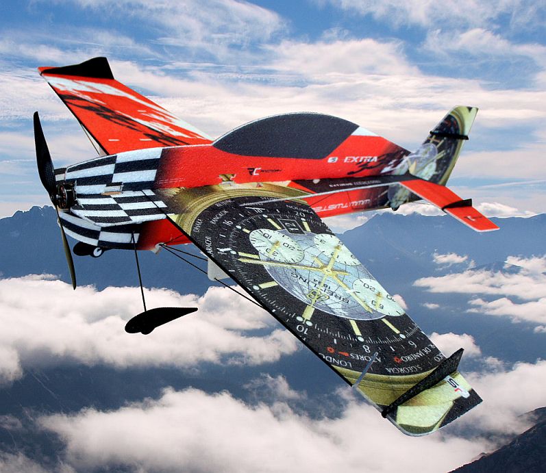 Extra 330 SuperLITE. This amazing model is the result of more than 3 years of refining and development by the indoor aerobatic pioneer and World Air Games competitor Jan Spatny. Wing span: 840mm, lenght 900mm, weight 120-150g, motor: 60-100W.  Sisältää kääntyvän moottoripukin, thrust vector asennuksiin.