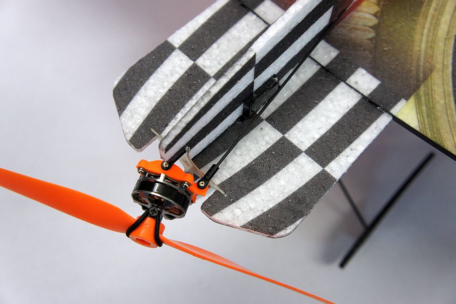 This amazing model is the result of more than 3 years of refining and development by the indoor aerobatic pioneer and World Air Games competitor Jan Spatny. Oversize controls, the right distribution of fuselage side area and side-to-side thrust vectoring give this model some truly unique abilities. Whip-like snap rolls, tight knife edge loops or any other maneuver you can think of, there is nothing this plane couldn't do. Light 4mm EPP construction gives the model flying qualities on par with the best milled-out Depron planes, with the added advantage of much better durability.