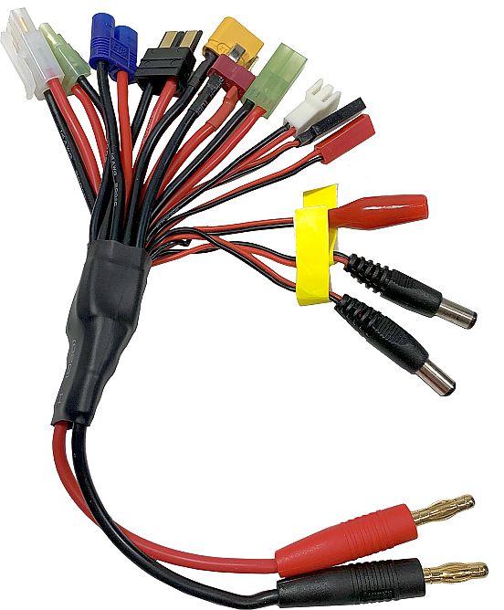 Latausjohto kullatuilla 4,0mm liittimillä. Latausjohto paksu 14 AWG johto. 18 AWG johdot XT60, DC3, EC3, Ultra plug, Traxxas, Tamiya. Tamiya mini (male + female), micro-plug, JST, Futaba ja JR lähettimille ja vastaanottimelle.