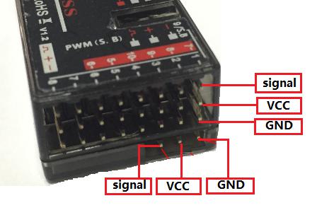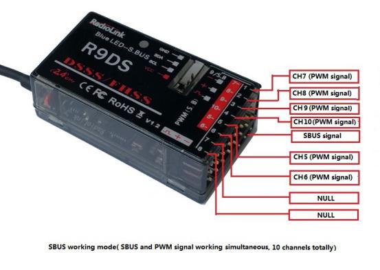 (2) SBUS signal output working mode: blue/purple LED indicates SBUS signal output, 10 channels totally. SBUS and PWM signal possible working at the same time with SBUS signal output working mode. CH9 output SBUS signal, the original CH1 to CH4 output CH7 to CH10 PWM signal at the same time.