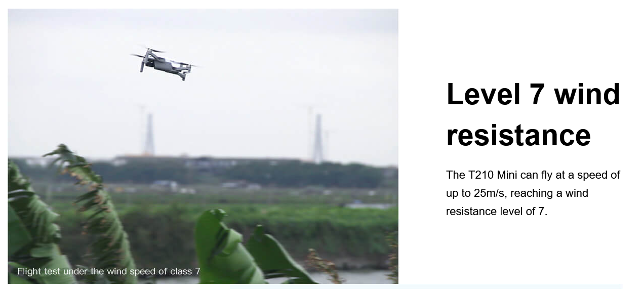 Alle 249g, 8000x6000 kuvien tarkkuus ja 4K 30FPS video. Useita automaattisia kuvaustiloja ja optical flow kamera sisänavigointiin. Kestää jopa 10 m/s tuulta ja maksimi lentonopeus 10 m/s (ilmanopeus max. 20m/s). Lentoaika 30 minuuttia. USB-C lataus. Walkera T210 mini SE voi seurata jopa 40km/h kulkevia kohteita ja pienestä koostaan huolimatta voit lentää sitä kovallakin tuulella.